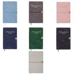 Гибкая обложка еженедельника VELOUR выполнена из искусственной кожи с выразительным бархатным покрытием. Две функциональные шильды на лицевой и оборотной стороне обложки с углублениями для поперечной резинки обеспечивают удобную и надежную фиксацию дневника в закрытом состоянии. Дизайн гармонично дополняет и обогащает тонированный золотым цветом срез внутреннего блока и тиснение золотой фольгой рока и надписи на лицевой стороне обложки.