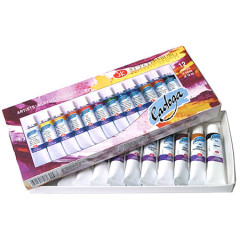 В состав набора входит 12 красок в тубах по 18мл.: белила титановые, желтая средняя, охра света, красная, розовая темная, зеленая средняя, голубая ФЦ, ультрамарин, умбра жженая, сиена жженая, черная, сажа газовая.