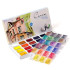 В состав набора входит 24 краски в кюветах: белила цинковые, ганза лимонная, желтая средняя, желтая темная, охра золотистая, оранжевая, красная светлая, карминовая, краплак красный, английская красная, голубая, ультрамарин светлый, синяя, сине-зеленая, фиолетовая светлая, фиолетовая темная, изумрудная, травяная зеленая, зеленая темная, сиена натуральная, сиена жженая, умбра жженая, сепия, сажа газовая.
