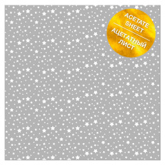 Ацетатний лист-прозора плівка з фольгуванням (білим тисненням) White Stars. Ця декоративна плівка широко використовується в скрапбукінге, кардмейкінге, як елемент декору, для створення конвертів, подарункової упаковки, роздільників для альбомів і блокнотів.