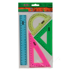 - Набір: лінійка 20 см, кутник 45 ° і 90 °, кутник 60 °, транспортир 180 °.