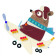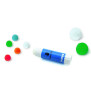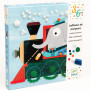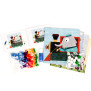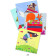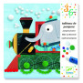 Набір складається з 4 картинок з кумедними тваринами на різних транспортних засобах, різнокольорових помпонів і клейового олівця.
