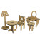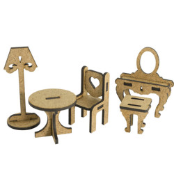 - У наборі: столик - 35х40х40 мм, торшер - 70х30х30 мм, пуф - 25х25х25 мм, стільчик - 50х25х25 мм, трюмо - 60х50х15 мм