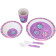 - Набір складається з п'яти предметів: глибока і дрібна тарілки, чашка, ложка і виделка