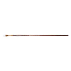 Кисть плоская из волоса синтетики. Стандартная выставка рабочей части. Белоснежный средне упругий волос, который включили в себя все три важных показателя: способности образовывать острый кончик, упругости волосяного пучка, контролю над текучестью краски. Такой кистью наносят широкие ровные мазки, ею хорошо работать на крупных участках холста. Кисть представлена на длинной ручке. Благодаря густоте и длине волоса, кисть удерживает много краски.