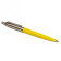 Жовтий пластиковий корпус зі сталевим ковпачком та хромованим оздобленням. Класичний механізм-кнопка з приємним звучанням клацання. У жовтій ручці – кульковий стрижень QuinkFlow: середня товщина письма = 1 мм – синє чорнило. Набір постачається у подарунковому футлярі Parker.
