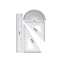 - Комплектація: лінійка (15 см), два трикутника, транспортир.