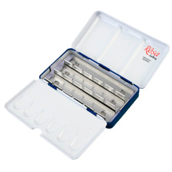 Пенал вміщує 12 кювет, які зручно висуваються, дозволяючи легко змішувати фарби і створювати нові відтінки. Металеве покриття кювет стійке до корозії, а гладка поверхня полегшує очищення після використання.