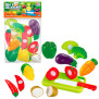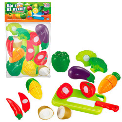 Маленькі фігурки овочів складаються з декількох частин, які скріплюються між собою за допомогою липучок. Гра дає дитині можливість навчитися користуватися ножем, вивчити нові слова, сортувати овочі та фрукти за ознаками або кольорами, ознайомитися з особливостями кожного продукту, а також їхніми корисними властивостями.