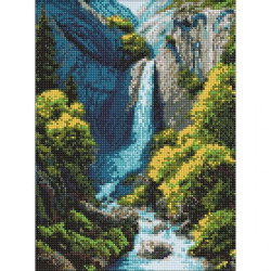 Набір для створення мальовничої картини із зображенням гірського пейзажу та стрімкого водоспаду. Поєднання природних відтінків та мерехтливий блиск страз надають зображення глибину, динаміку та реалістичність.