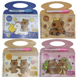 Книжка-розмальовка «Лідер малюємо водою + пензлик» з милими капібарами. Дитина розфарбовує картинки звичайною водою: достатньо провести вологим пензликом по сторінці, і зображення стає яскравим. Після висихання кольори зникають, і забарвлення можна використовувати знову.