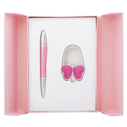 У наборі кулькова ручка і гачок для сумки.
