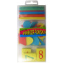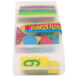 Комплект "Вчимося рахувати" від українського виробника "Атлас" включає картки з цифрами від 0 до 9, кольорові рахункові палички, математичні символи, геометричні фігури (коло, трикутник, квадрат та ін.).