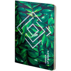 Colors of Nature 8453-01-A - ефектний блокнот, в якому поєднується висока якість матеріалів і стильне оформлення. Картонна обкладинка декорована принтом в сріблясто-зеленій колірній гамі. Соковита насичено-смарагдова листя доповнена лаконічним геометричним малюнком. Дизайн блокнота немов випромінює спокійну гармонію природної природності. На гладку кремову папір щільністю 70 г / м.кв нанесена делікатна сіра Лініювання в клітку. Куточки плавно закруглені.