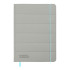 Жесткая обложка ежедневника AURA изготовлена из искусственной кожи с эффектом soft touch, с поролоном. Стиля обложке придает декоративный щов по периметру и широкими горизонтальными полосами, а также слепое тиснение года. Оригинальный акцент создает продольная круглая бирюзовая резинка для надежной фиксации ежедневника в закрытом состоянии и тонирование среза внутреннего блока цветом бирюзы.