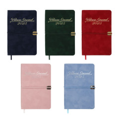 Гнучка обкладинка щоденника VELOUR виконана з штучної шкіри з виразним оксамитовим покриттям. Дві функціональні шильди на лицьовій та зворотній стороні обкладинки з поглибленнями для поперечної гумки забезпечують зручну та надійну фіксацію щоденника в закритому стані. Дизайн гармонійно доповнює та збагачує тонований золотим кольором зріз внутрішнього блоку та тиснення золотою фольгою року і напису на лицьовій стороні обкладинки.