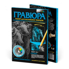 Гравюра Фантазер 'Три коня' - цікавий творчий набір для дитини, допомагає у формуванні дрібної моторики рук і художнього смаку у дітей. Адже з її допомогою дитина може творити картини, гідні великих майстрів. Техніка гравюри неповторна, але дуже легка. Вона прийшла до нас зі Сходу, де з'явилася кілька століть назад. Для створення гравюри потрібно спеціальним ножем-скребком процарапать зверху по контуру малюнка, який нанесений заздалегідь, на багатошаровому панно, яке має металеві
