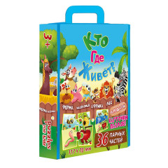 Не тільки розвага, а й навчання міні-пазли Хто де живе (Strateg 30702) познайомлять малюка з мешканцями ферми і ліси, тваринами Африки і комахами. Крім цього покажуть місця, де вони мешкають. Всього в наборі 36 міні-пазлів, що складаються з двох частин необхідно підібрати кожній тварині його житло. Щоб допомогти малюкові в комплекті є картки з готовими картинками. Процес складання малюнка з окремих фрагментів зображення допоможе розвинути не тільки логіку, уяву, пам'ять, але і фі
