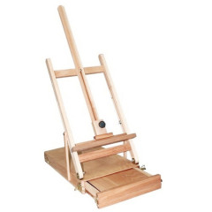 Мольберт невеликих розмірів, хороша регулювання робочої частини мольберта. настільний завзятий мольберт виготовлений з просоченого лляною олією чистого карпатського бука і є стійким і міцним. Передбачено плавне регулювання кута нахилу робочої частини. По висоті робоча частина мольберта регулюється двома двіжущеміся планками-регуляторами. А також в даній моделе передбачений скриньку для різних пренадлежностей художника.