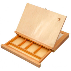 Британський етюдник - це стильний планшет-пенал TART сезону 2020 для акварельного та пастельного живопису. Такий органайзер буде зручним і функціональним, як для накоління пленера, так і для настільної роботи художника. Конструкція дерев'яного ящика ящик з секціями для художнього інструменту Планшет має ступінчасте регулювання кута нахилу на 4 позиції і маленьку полицю для опори роботи. Текстура березової фанери і букової деревини надають органайзера особливого естетичного вигляду.Поверхня етюдника покрита захисним шаром лаку, а на його нижній стороні прикріплена гумові ніжки.
