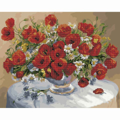 Алмазна картина-розмальовка Маки і ромашки, унікальний сюжет, який потрібно частково розмалювати, а частково заповнити кольоровими камінцями. Готова картина набуває 3D - ефект за рахунок комбінування алмазних камінчиків і фарб. В результаті Ви отримаєте шедевр, який буде мерехтіти під сонячними променями і одночасно прекрасно передасть всю глибину кольорів. Це не на любителя, це сподобається всім!