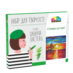Склад набору: - полотно ручної роботи на підрамнику (25*35 см), ТМ "Етюд" (Україна) - набір масляної пастелі - 24 кольори, ТМ "Сонет" (Росія) - олівець, ТМ "Cretacolor" (Австрія) - гумка -клячка, ТМ "DKArt&Craft" (Китай) - копіювальний папір - зразок готової картини - покроковий майстер-клас, опис техніки